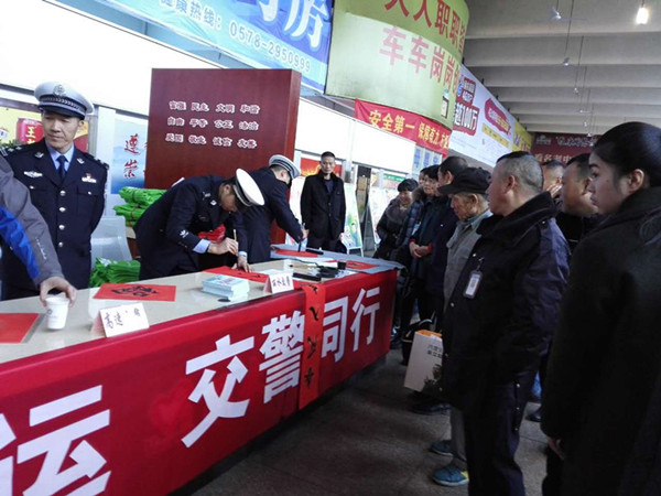 今天麗水市高速交警同志也給旅客帶來(lái)可驚喜,他們揮動(dòng)手中的毛筆為旅客寫(xiě)下一幅幅承載著吉祥、平安的春聯(lián),旅客們拿著春聯(lián)露出幸福的笑容,為春運(yùn)添上了一抹光彩。