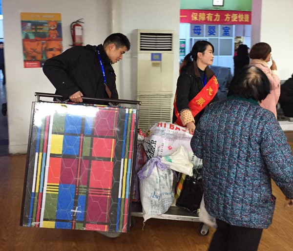 這時,業(yè)務(wù)站站長陳樂觀恰巧巡查到南大門,見狀立刻上前一把接過折疊椅說道:“趕緊放手,本來腰就不大好,回家還要帶小孩,萬一再出點閃失扭了腰,連小孩都抱不動就麻煩了?!币宦犑且粋€新媽媽,傍邊的大媽更是心疼了,“小姑娘,我不知道你還是新媽媽,來來來,趕緊把床給我”,說著就伸手去接床。“沒事,沒事,再堅持一下就到了,你趕緊進去,快開車了?!?br/> 劉虹在陳樂觀的幫助下,一路將行李送過了安檢口、檢票口,并安安穩(wěn)穩(wěn)的裝上了車??粗鴦⒑鐬樽约好η懊螅樌宪嚨拇髬屌R開車前,透過車窗感動地說,“謝謝!謝謝!要不是你們,我一個人這么多東西真不知道該怎么辦才好,你們真是大好人!”