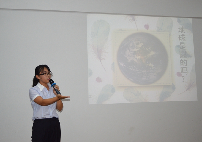 當(dāng)時所有聽到這個開頭的人都笑了,我想在座的各位也一定在偷偷的笑著,看,這個傻姑娘,在想什么?地球不是圓的,難道是方的?(笑)