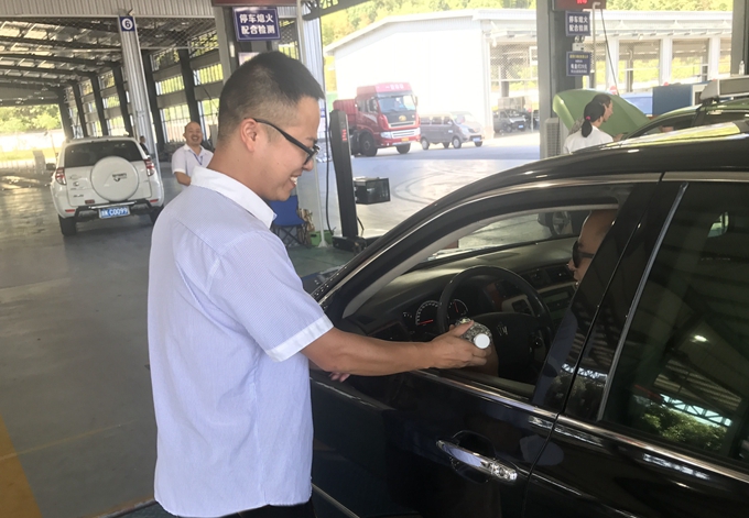 8月29日上午10點(diǎn),在安檢站的外檢車間,每條檢測線上整齊擺放著兩箱礦泉水,線上的檢測員微笑著向來參檢的車主發(fā)放礦泉水。