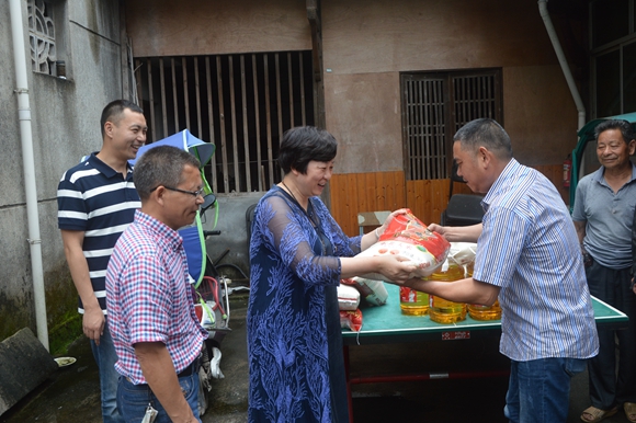 會后,集團(tuán)公司黨委為村養(yǎng)老中心送去米、油等慰問品。