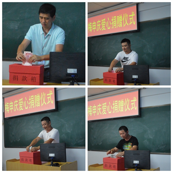 6月29日下午3時,愛心捐款儀式在汽校教室舉行。校領(lǐng)導(dǎo)帶頭捐款,汽校教練員工也積極參加,大家都踴躍地為梅申慶向上了自己的一份愛心,還有兩位學(xué)員還專門托教練捎來了捐款。短短幾分鐘內(nèi),就為梅申慶募捐到愛心款 3055元。汽校的金健飛校長更是在第一時間將這份汽校家人的關(guān)愛送到了在醫(yī)院接受化療的梅申慶手中。