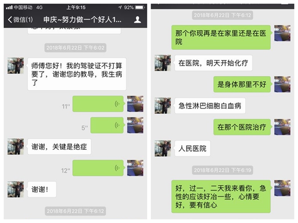 經(jīng)核實,這條消息是浙K0058教練車學(xué)員梅申慶發(fā)出的求助消息,該車教練員周偉在6月22日也收到了學(xué)員梅申慶的微信留言,表示不能繼續(xù)學(xué)車了,周偉就很納悶,問他好好為什么不學(xué)了。梅申慶回答說自己生病了,而且得的是絕癥--突發(fā)性白血??!周偉教練當(dāng)時感到很震驚,想不到前幾天來學(xué)車時還好好的一個學(xué)員,怎么突然間就得了重病。他知道白血病治療需要巨額費用,梅申慶家經(jīng)濟條件又不是很好,當(dāng)即發(fā)了188塊微信紅包鼓勵梅申慶樹立信心、積極接受治療。