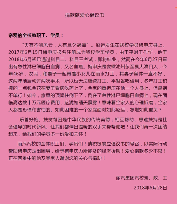 6月27日,麗汽集團汽車技術(shù)學(xué)校的微信公眾號收到一條來自學(xué)員的消息:“我是麗汽汽校的一名學(xué)員,突患急性淋巴細(xì)胞白血病,希望汽校領(lǐng)導(dǎo)能幫我籌點款,謝謝!”
