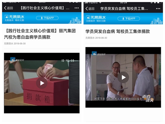 得知麗汽集團汽校這樣一家培訓(xùn)機構(gòu),能自發(fā)為身患重病的外地學(xué)員組織愛心捐款后,麗水公共頻道新聞和文化休閑頻道老白談天欄目專門就這一事件進行了專題報道,稱贊這是一個踐行社會主義核心價值觀的愛心故事。