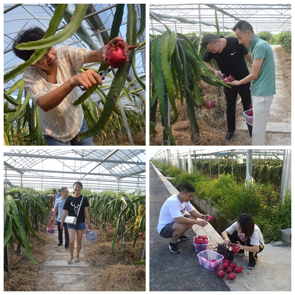 在缸窯村火龍果采摘基地,工作人員向大家介紹了基地火龍果的無公害種植模式和火龍果果肉、果皮以及花朵的食用價值。工會主席(組長)們也親自體驗了一把火龍果的采摘。看著枝頭紅艷誘人的果實,大家臉上掛滿了的豐收喜悅。