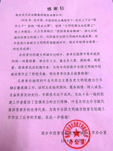 信中還特別表揚(yáng)了從集團(tuán)公司抽用的葉圣天同志,在工作中服務(wù)熱情、待人誠(chéng)懇、設(shè)備保養(yǎng)及時(shí)到位、專職技術(shù)運(yùn)斤成風(fēng),為戰(zhàn)斗在一線的創(chuàng)建工作者提供了堅(jiān)強(qiáng)有力的出行保障。葉圣天同志作為麗汽集團(tuán)抽用的、主要負(fù)責(zé)文明創(chuàng)建出行車輛后勤保障工作的優(yōu)秀駕駛員代表,為我市全國(guó)文明城市經(jīng)?;瘎?chuàng)建工作作出了應(yīng)有的貢獻(xiàn)。