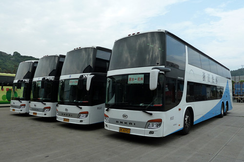 根據(jù)杭州線客流穩(wěn)中有升,尤其是周末及節(jié)假日運(yùn)力不足的情況,8月3日,快客分公司新購(gòu)置的4輛55座安凱客車上線營(yíng)運(yùn)。新購(gòu)置的55座安凱豪華客車為雙層豪華大巴,上層40座,下層15座。下層配備3臺(tái)15寸液晶,上層配1臺(tái)17寸彩色液晶,該車的倒車監(jiān)視器還帶多動(dòng)畫面,能手動(dòng)切畫,監(jiān)視上下層車內(nèi)情況,配備電子巡航系統(tǒng)等。車身13.7米,比原杭州線所用的37座安凱客車車身長(zhǎng)1.7米。