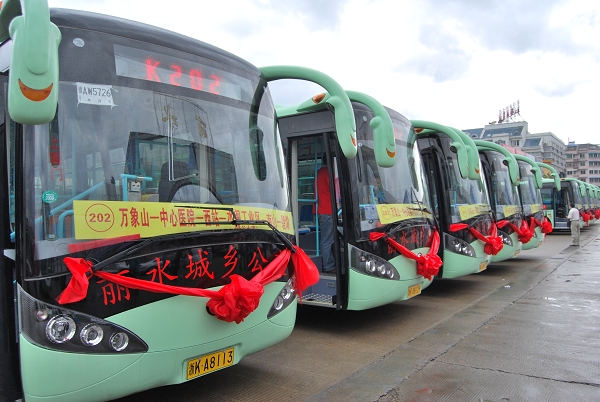 萬象山至碧湖線路起止站分別為萬象山、碧湖,途經(jīng)市中心醫(yī)院、三巖寺、汽車西站、九里村、高速路口等26個站點,總里程約21公里;火車站至大港頭路線起止站分別為火車站、大港頭,途經(jīng)汽車東站、九里村、泰隆銀行、星火商城、三巖寺等40個站點,總里程約38公里。這兩條線路共投入14輛空調(diào)大巴車,分別每隔12分種、25分鐘發(fā)車,全程票價均為3元,公交運營時間夏季為5∶30-18:30,冬季為6:30-17:30。 兩條線路的開通將進一步滿足人民群眾的出行需求,加快城鄉(xiāng)道路運輸結(jié)構(gòu)的調(diào)整,有效整合和充分利用城鄉(xiāng)客運資源,加快農(nóng)村城鎮(zhèn)化進程,提高城鄉(xiāng)客運的整體發(fā)展,促進城鄉(xiāng)經(jīng)濟全面協(xié)調(diào)發(fā)展。