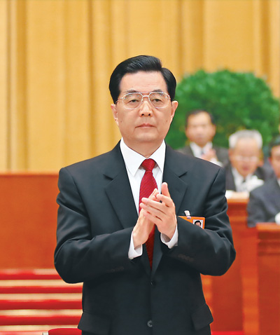 胡錦濤、吳邦國、溫家寶、賈慶林等在主席臺就座。