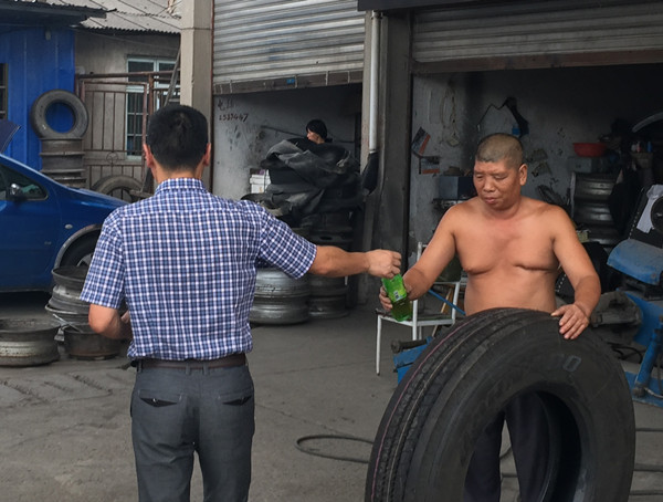 王斌副經(jīng)理為車間的修理工送上清涼,修理工接過后連說:“謝謝領導關心?!?/p>