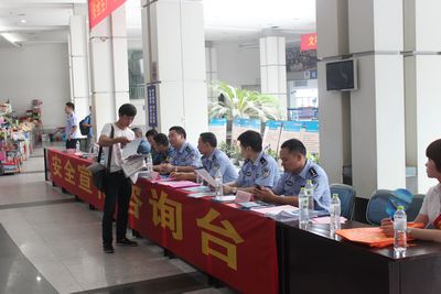 活動(dòng)現(xiàn)場(chǎng)懸掛了安全生產(chǎn)宣傳標(biāo)語(yǔ),設(shè)置了安全咨詢臺(tái),并在候車室前廳、中廳等人員聚集的位置,放置了各類以安全為主題的宣傳版畫,圖文并茂的向旅客宣傳了防詐騙、交通、防恐等安全知識(shí)。在整個(gè)活動(dòng)期間,到咨詢臺(tái)來(lái)現(xiàn)場(chǎng)咨詢的旅客絡(luò)繹不絕,各單位咨詢?nèi)藛T還向旅客發(fā)放了《平安交通 人人有責(zé)》、《警民相約 共建和諧》、《公民防范恐怖襲擊手冊(cè)》、《為防范與遏制“電信(網(wǎng)絡(luò))詐騙犯罪”致市民的一封信》等十余種安全生產(chǎn)宣傳資料共計(jì)2000余份,營(yíng)造了安全生產(chǎn)月活動(dòng)的良好氛圍。