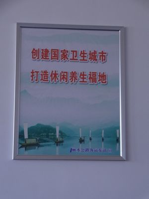 現(xiàn)在,墻上懸掛的是創(chuàng)衛(wèi)口號與麗水山水風(fēng)光相結(jié)合的宣傳畫,賞心悅目。