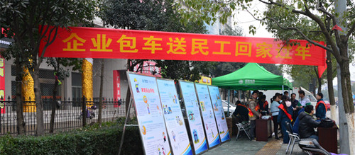 為確保民工回家之路走得更順利,1月7日,在麗水開發(fā)區(qū)舉行的“民工服務月”中,處州晚報、麗水市總工會和麗汽集團聯(lián)合推出“企業(yè)包車送民工回家”活動,向民工朋友發(fā)放了100多份“企業(yè)包車送民工回家”宣傳資料,現(xiàn)場辦理企業(yè)包車、拼車和散票購票業(yè)務。