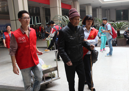 在西站候車大廳內(nèi)因?yàn)橛羞@樣一群身穿“紅馬甲”的志愿者變得格外溫馨。他們有的穿梭于人潮中,指引旅客在哪個(gè)檢票口檢票;有的為旅客送開水;有的引導(dǎo)旅客安檢、幫忙旅客提行李;有的帶著鉗子、熟料袋清撿站前廣場(chǎng)上的白色垃圾、清鏟地面口香糖;有的在候車室勸導(dǎo)不文明行為,例如吸煙、隨地亂丟垃圾等。在西站工作人員和志愿者的辛勤付出,讓繁忙的車站客流、車流秩序井然。