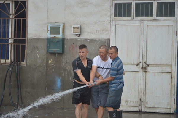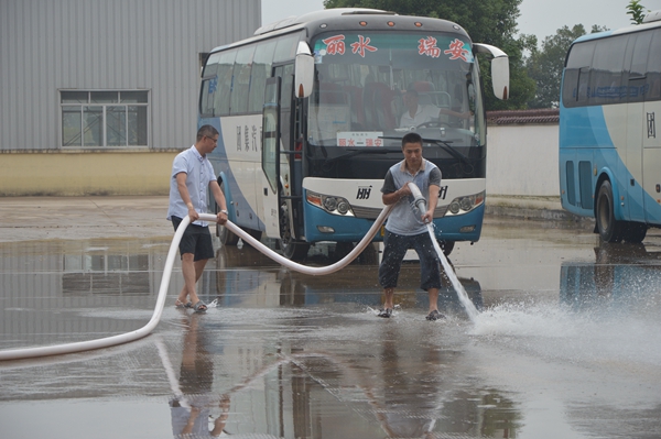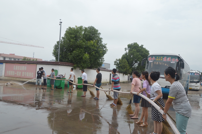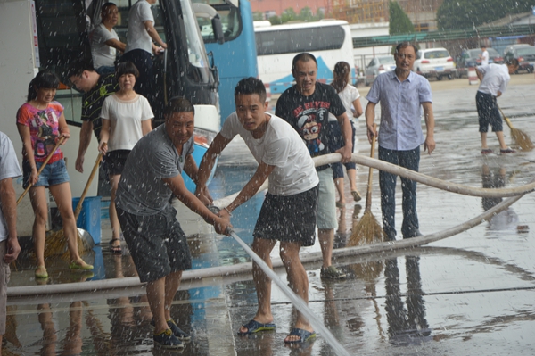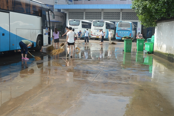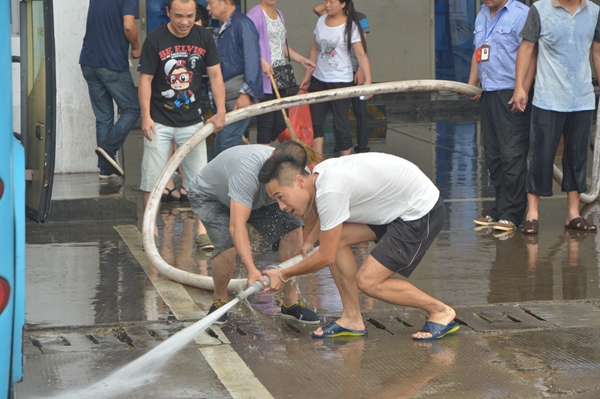 長運(yùn)公司修理車間、調(diào)度室等昨天也受到了重創(chuàng)。一大早,修理工師傅們早已拿起水槍,打掃修理車間;員工們開始沖洗辦公場地。