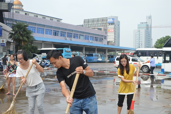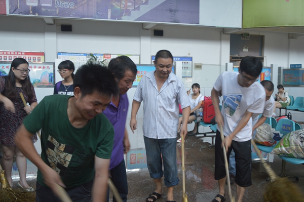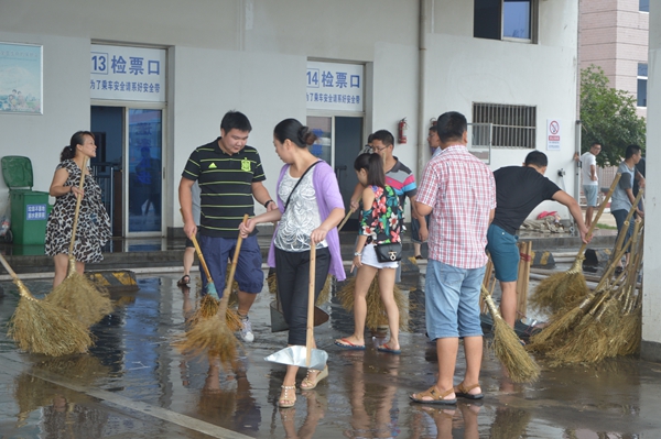 旅游集散的青年隊(duì)伍來了,經(jīng)理葉劍飛和員工們一道正起勁地沖洗著候車室。