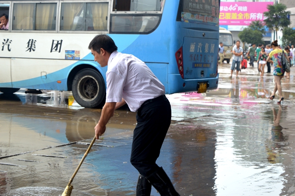 東站的站場上,到處是兄弟單位救援人員的身影。有的參與到電力搶修、有的維護(hù)秩序、有的引乘導(dǎo)乘,大部分人參與到清掃站場中:前面人員拉起消防帶、把好水槍,沖到哪片淤泥,后面人員就掄起掃把跟到哪,快速把污泥、污水沖掃到陰溝里,配合得恰當(dāng)好處。烈日下,個(gè)個(gè)揮汗如雨,濕透了衣服,有的赤著腳,有的索性光著膀子。水槍沖到哪,掃到哪,身后留下一片片潔凈的場地。