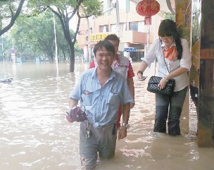 洪水突襲市區(qū)后,售后接待電話就接連不斷,傳來的都是客戶急切救援的聲音。為更快速的開展救援工作,20日下午,夏偉強(qiáng)經(jīng)理親自帶領(lǐng)施救組在一線實(shí)地指揮搶險救災(zāi);經(jīng)理助理金虹則帶領(lǐng)銷售團(tuán)隊分組分頭沿著水路挨家挨戶上門咨詢、了解車輛受災(zāi)情況,以便施救車輛更快的實(shí)施施救工作;經(jīng)理助理呂佩軍在現(xiàn)場與售后師傅們現(xiàn)場轉(zhuǎn)移車輛,推、拉、移所有的招式都用上了。渾濁的污水都沒過了大腿,他們都無所畏忌。