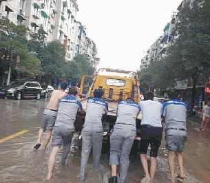 20日的洪水從清晨開(kāi)始就一直處于上漲過(guò)程當(dāng)中,市區(qū)多處受淹嚴(yán)重。為更快速的搶救進(jìn)水車輛,安撫客戶情緒,在指揮中心的統(tǒng)一指揮下,多組救援小組深入各受災(zāi)片區(qū),他們與洪水周旋,在水中作戰(zhàn),開(kāi)展搶救工作 。在水東、在夏河、在三巖寺,救援小組一方面與客戶積極聯(lián)系溝通,了解受災(zāi)情況; 一方面趟入渾濁的洪水中積極找尋施救線路。因水位不斷上漲,水東大橋、三巖寺等路段交通相繼中斷,施救車輛根本就進(jìn)不了受災(zāi)片區(qū),已進(jìn)入受災(zāi)片區(qū)的也開(kāi)展不了救援工作,個(gè)別施救車輛還受困于現(xiàn)場(chǎng),這可急壞了救援人員和客戶。隨著時(shí)間的推移,指揮中心積壓的待救援信息越來(lái)越多。水不退,車就進(jìn)不去,光靠人在水中推是解決不了問(wèn)題的,怎么辦? 伊翔公司一方面隨時(shí)關(guān)注水位情況,一方面積極向各方求援,待水位梢有下降,適合搶救時(shí),能迅速全面開(kāi)展搶救工作。