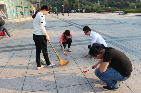 鏟刀、清潔刷、掃把、水管……清潔工具一一分配到手中之后,大家便熱火朝天的干起來。雖已入秋,但午后的太陽依然刺眼,沒一會(huì)兒,大家都開始冒汗,但誰也沒停下手中的勞動(dòng),依舊頂著太陽蹲在地上鏟口香糖或是奮力地洗刷地面。