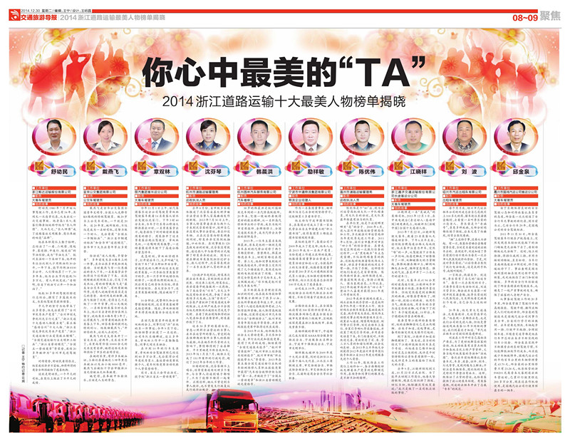 “2014年度浙江道路運(yùn)輸十大最美人物”,涵蓋了全省11個(gè)地市的一線執(zhí)法、窗口、行政人員,貨運(yùn)經(jīng)理人,客運(yùn)、出租車、公交司機(jī)等工種,拼出了浙江道路運(yùn)輸行業(yè)“最美方向盤”圖譜。章雙林有幸成為麗水唯一入選的最美人物。