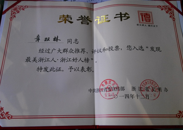 “發(fā)現(xiàn)最美浙江人--浙江好人榜”推薦評選活動由省委宣傳部、省文明辦聯(lián)合開展,每月推薦評選一次,旨在為大力培育和弘揚(yáng)社會主義核心價值觀,積極普及和踐行當(dāng)代浙江人共同價值觀,進(jìn)一步深化“發(fā)現(xiàn)‘最美浙江人’、爭做‘最美浙江人’”主題宣傳實(shí)踐活動,健全和完善“浙江好人”選樹和培育機(jī)制,推動“最美”從“盆景”變成“風(fēng)景”、從“風(fēng)景”變?yōu)椤帮L(fēng)尚”。推薦評選分為助人為樂類、見義勇為類、誠實(shí)守信類、敬業(yè)奉獻(xiàn)類和孝老愛親類五個類別。評選活動經(jīng)過網(wǎng)絡(luò)投票、群眾評議、專家評審等環(huán)節(jié),12月份共評選出25名浙江好人,章雙林入選見義勇為類浙江好人。