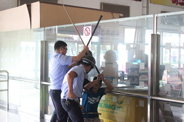 行車(chē)員發(fā)現(xiàn)普客候車(chē)廳內(nèi)有一名醉酒男子情緒激動(dòng)揮舞木棍,危及旅客安全,立即跑向調(diào)度室向業(yè)務(wù)站值班站長(zhǎng)報(bào)告,值班站長(zhǎng)接到報(bào)告后通過(guò)對(duì)講機(jī)向其它崗位呼叫。并立即組織本部門(mén)值班人員趕到現(xiàn)場(chǎng)將旅客疏散到安全的區(qū)域;保衛(wèi)科接到報(bào)告后立即做出回應(yīng),啟動(dòng)反恐防范應(yīng)急預(yù)案,攜帶反恐防范器具前往現(xiàn)場(chǎng)控制住施暴者;同時(shí)由2名保衛(wèi)人員組成警戒協(xié)調(diào)組也到達(dá)現(xiàn)場(chǎng)負(fù)責(zé)外圍的警戒工作。