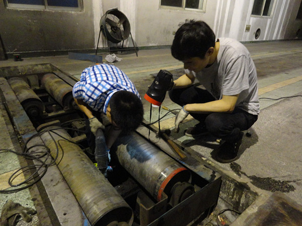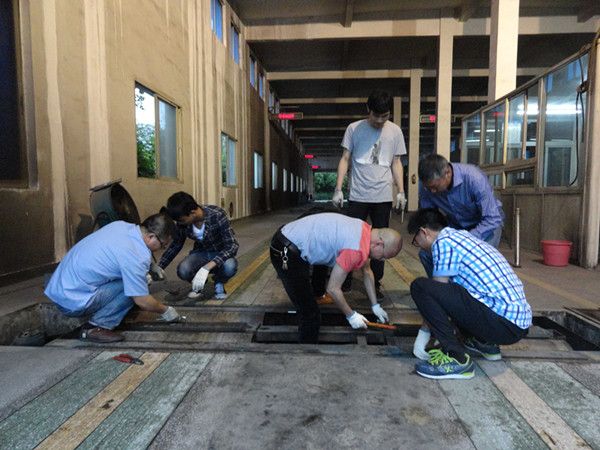 7月7日下午臨下班前,綜檢站1號檢測線的車速臺突然發(fā)生故障,舉升器無法正常升降。故障就是命令,為確保綜檢站高峰期檢測不受影響,檢測車間立即組織骨干人員對車速臺進(jìn)行檢查,就連正在年休的車間主任金軍輝也聞訊趕回與部門員工一同作戰(zhàn)。經(jīng)過一番拆卸檢查,故障點(diǎn)基本確定是油缸漏油和舉升橫梁斷裂。可是,要維修這兩個大部件,就需要拆掉整個工位機(jī)的核心部分,其工作量和工作難度之大,讓在場的搶修人員都不由的皺緊了眉頭。面對艱巨任務(wù),車間副主任、高級技師金曉東發(fā)揮了黨員先鋒模范帶頭作用,迅速帶領(lǐng)青年員工對舉升橫梁進(jìn)行焊接技術(shù)改造。車間員工們也齊心協(xié)力開始拆卸工位機(jī),更換油缸油封、密封圈等。白天已超負(fù)荷工作的檢測車間員工,不知不覺又堅(jiān)持了9個多小時(shí),直至7月8日凌晨01點(diǎn),最終圓滿完成了車速臺搶修任務(wù),確保了綜檢站高峰期檢測不受影響。