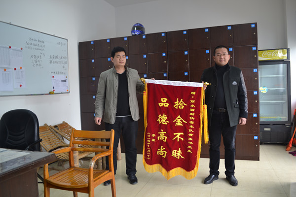 12月21日下午2點,失而復(fù)得4萬現(xiàn)金的李先生手拿錦旗來到快客車隊,一再對黃樂平師傅拾金不昧的行為精神表示感謝,他說:“黃樂平師傅在發(fā)現(xiàn)遺失物品時,能夠包管完好,可見平時他就是一位非常盡責(zé)的駕駛員。那天我發(fā)現(xiàn)丟了4萬元現(xiàn)金的時候,我頓時全身冒冷汗,這可怎么辦好呢。當(dāng)我趕回麗水,看到拉桿箱好好的放在這里時,我懸著的心終于放下了?!崩钕壬f:“今天我送來一面錦旗,就是再次感謝敬業(yè)的黃師傅,感謝公司培養(yǎng)出的駕駛員如此優(yōu)秀,希望公司能多宣傳正能量,多表揚黃師傅這樣的好人”說著,李先生將一面印有“拾金不昧 品德高尚”的錦旗送到余副經(jīng)理手中(因黃樂平出車,未能和乘客碰面)。