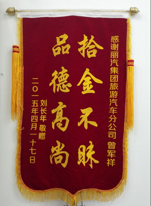 旅客劉長年回顧說,自己在4月15日來麗水市委黨校開會,會議包的是麗汽集團旅游汽車分公司的車。晚上會議結束以后就直接下車了,當時也沒有留意自己的錢包丟在車上,后來到了賓館才發(fā)現(xiàn)自己錢包丟了,十分的著急,因為自己是華僑,包里面的很多卡十分的重要,而且補辦起來很困難。后來問了經辦人才得知駕駛員的電話。第2 天來到麗汽集團旅游汽車分公司的時候,發(fā)現(xiàn)自己的錢包已經安安全全的放在前臺工作人員那里了。我當時拿了500塊錢想感謝駕駛員,但是好心的駕駛員婉言拒絕了,就說了句“這是應該做的”。我想想還是做點實際的來表示我對這位拾金不昧、品德高尚的駕駛員的謝意,所以就送上了這面錦旗。