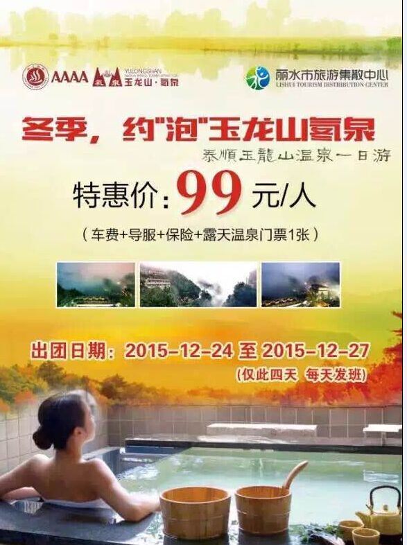 “溫州泰順玉龍山氡泉99元一日游”是集散中心即將在12月24-27日期間推出的一款特惠旅游產(chǎn)品,即在12月24日至27日期間,集散中心全天接受和發(fā)送前往溫州泰順玉龍山氡泉一日游,團費99元/人(包括車費、門票、導(dǎo)服費和保險費)。與平時的每人238元的團費相比,參加集散中心的特惠游,每人可以節(jié)省139元。