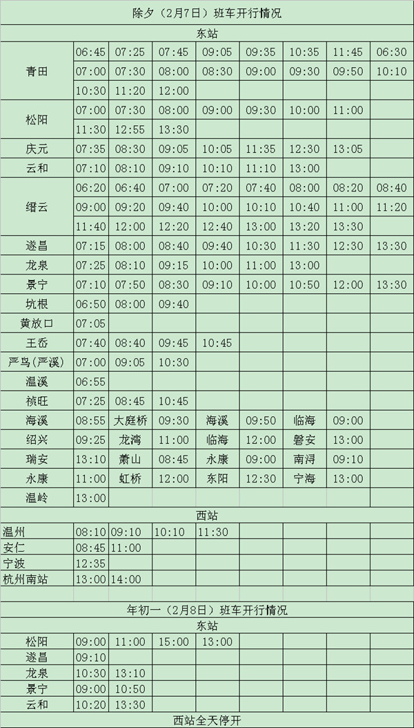 其中,除夕當(dāng)天, 西站有開往杭州、寧波、溫州等方向的市際班次和開往安仁的班車,最遲發(fā)車時(shí)間至14:00。東站有開往龍泉、 云和、 松陽、慶元、景寧、遂昌、縉云、青田及部分縣市下屬鄉(xiāng)鎮(zhèn)的縣際班車,以及前往臨海、紹興、龍灣、瑞安、蕭山、永康、虹橋、東陽、寧海、溫嶺等地的市際班車,最晚的發(fā)車時(shí)間為當(dāng)天中午13點(diǎn)30分。正月初一,西站全線停運(yùn);東站有發(fā)往龍泉、松陽、景寧、遂昌、云和方向的縣際班次 11班。根據(jù)班次安排,年初二客車班次逐漸恢復(fù),年初四起全部恢復(fù)正常發(fā)班。