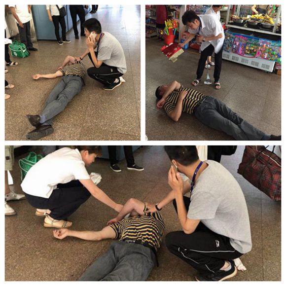 5月22日11時(shí)10分,東站的東大門進(jìn)口通道上,一名中年男子突然倒地,全身不停地抽搐,翻著白眼,嘴里不時(shí)往外冒出嘔吐物。這一幕恰巧被正在巡查場(chǎng)地的辦公室主任陳樂(lè)觀看到。陳樂(lè)觀趕緊上前查看,并急忙撥打120、110。聞?dòng)嵹s來(lái)的業(yè)務(wù)站副站長(zhǎng)封慧麗和潘何豐也加入了幫忙的隊(duì)伍。
