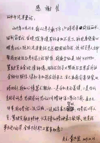 11月18日,東站服務(wù)臺(tái)收到了乘客章興佳親手送來(lái)的一封感謝信,這是一封寫給東站業(yè)務(wù)站站長(zhǎng)鄭宣偉的感謝信,信中寫到失主章興佳于10月21日從景寧乘車到麗水,不慎將手機(jī)遺落在車上,在他發(fā)現(xiàn)手機(jī)不見(jiàn)后,抱著僥幸的心里來(lái)到服務(wù)臺(tái)尋求幫助時(shí),業(yè)務(wù)站站長(zhǎng)鄭宣偉第一時(shí)間幫他聯(lián)系駕駛員尋找手機(jī)的事情。