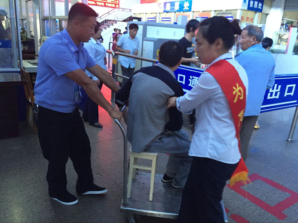 6月14日下午,在客運(yùn)東站的候車室里,一輛特殊的“輪椅”引起了大家的注意,只見東站副經(jīng)理戴宏星和保衛(wèi)科的熊宣標(biāo)推著由拉貨的行李車和小方凳組成的“輪椅”,余靜雙手扶著坐在“輪椅”上的旅客,他們?nèi)齻€(gè)人小心翼翼的護(hù)送旅客到檢票口。