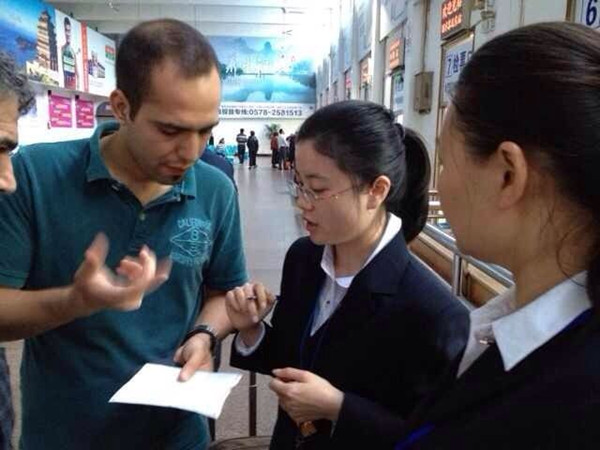 兩名外國旅客因?yàn)橛幸?,等不?:40的車。經(jīng)過葉菁的一再溝通,乘客在通完一通電話后表示自己的朋友愿意開車送他們?nèi)チx烏,就不再乘車了。充當(dāng)“翻譯”的葉菁又向宣站長轉(zhuǎn)達(dá)了他們的意思,站長當(dāng)即給他們辦理了退票手續(xù),手里握著退回金額的兩名外國旅客連連道謝,念叨著:“Thank you! Thank you!"并對(duì)葉菁的熱心幫忙豎起了大拇指。